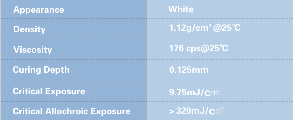 • Printed parts have excellent moisture resistance, good chemical resistance, and low shrinkage
