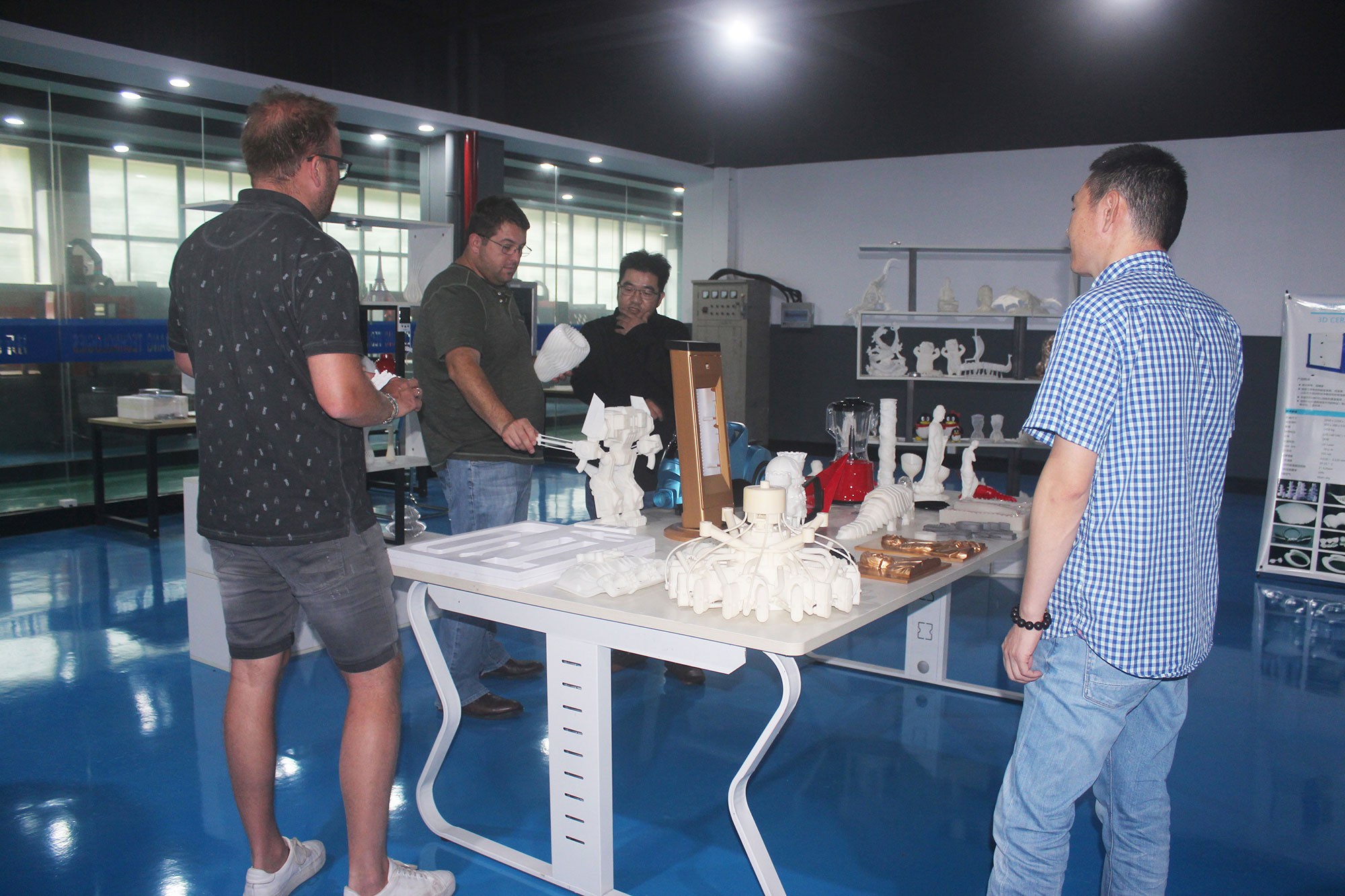 隨后,荷蘭客戶在陶總的陪同下參觀了3D打印車間、樣品間、CNC精雕車間,詳細(xì)了解了3D打印的工作原理,包括SLA工業(yè)級、FDM桌面級。荷蘭客戶代表Dennis表示:工作的3D打印機(jī)讓他意識到傳統(tǒng)制造業(yè)與3D打印技術(shù)的結(jié)合正在碰撞出新的科技火花,并希望在這個(gè)領(lǐng)域與浙創(chuàng)科技有進(jìn)一步的交流與合作。在參觀中,Dennis表示對于他們公司來說,借助3D打印技術(shù)能更好的優(yōu)化產(chǎn)業(yè)結(jié)構(gòu),助力企業(yè)可持續(xù)發(fā)展。同時(shí),荷蘭客戶對浙創(chuàng)科技自行研發(fā)的光敏樹脂進(jìn)行了高度的評價(jià)。