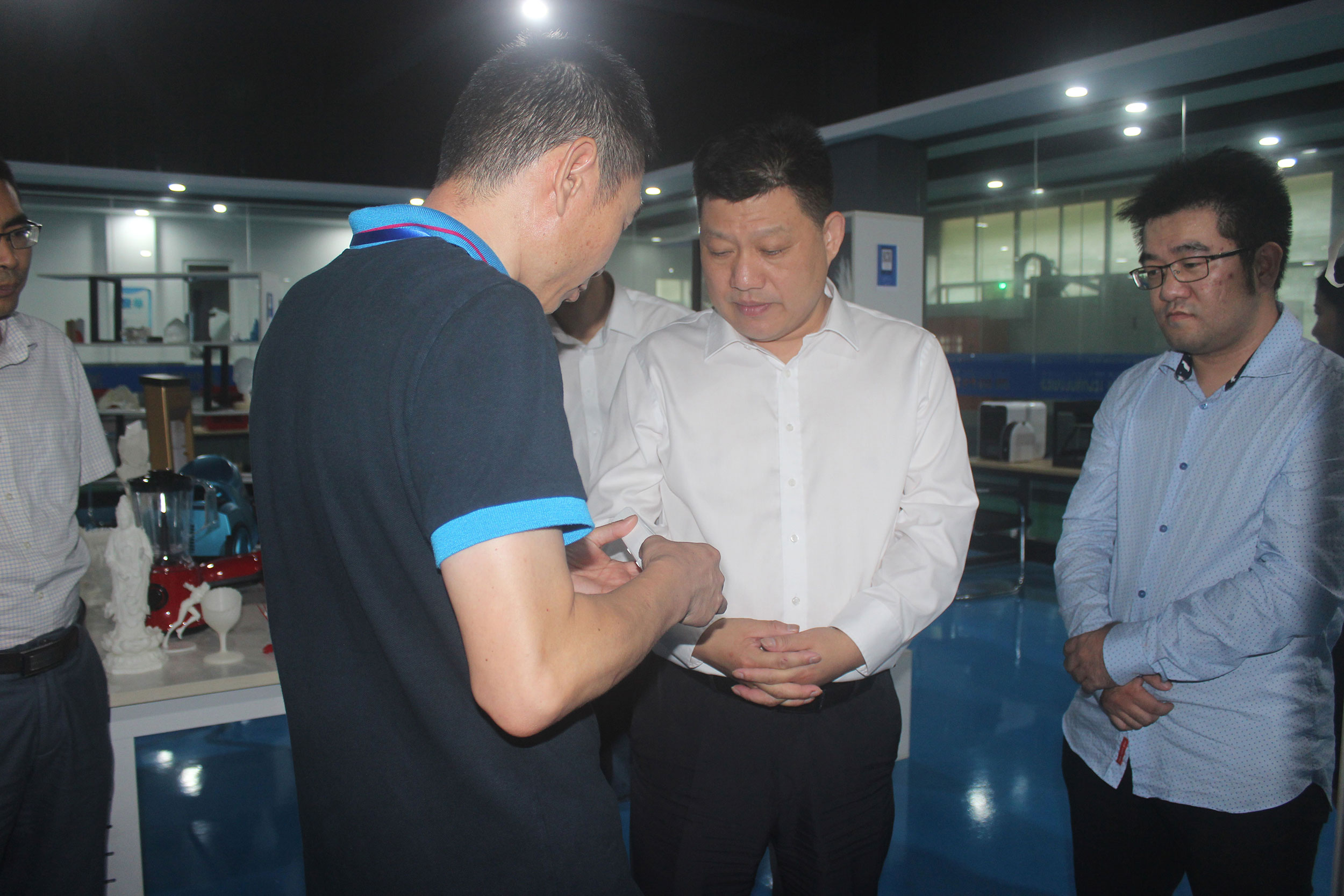 在3D打印產(chǎn)業(yè)園成立近一年之際,項敏市長再次調(diào)研浙創(chuàng)科技,陶董事長帶領(lǐng)項敏市長一行參觀3D打印車間和樣品間,展示近期最新研究成果,并就這大半年來浙創(chuàng)科技的業(yè)務(wù)發(fā)展、研發(fā)成果和人才合作等各方面向項敏市長一行進行了詳細的匯報。