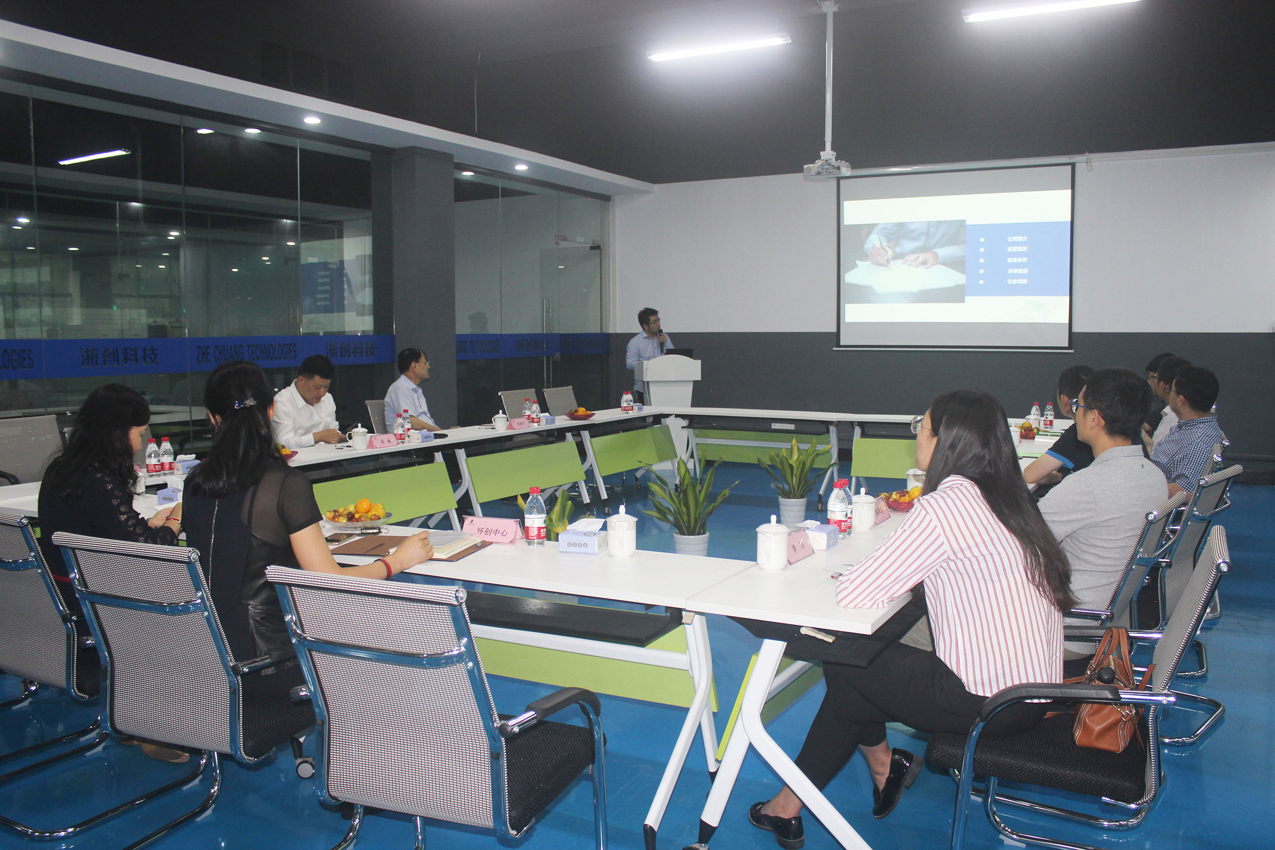 陶總經(jīng)理講解結(jié)束后,由任召輝教授代表浙江大學材料科學與工程學院發(fā)言。任教授說道:浙大浙創(chuàng)新材料聯(lián)合研發(fā)中心從去年合作至今一年多,浙大材料學院主要提供技術(shù)支持,并定期現(xiàn)場討論,提出解決方案。目前研發(fā)中心主要研發(fā)高分子材料,日后會擴展到陶瓷、金屬材料。
