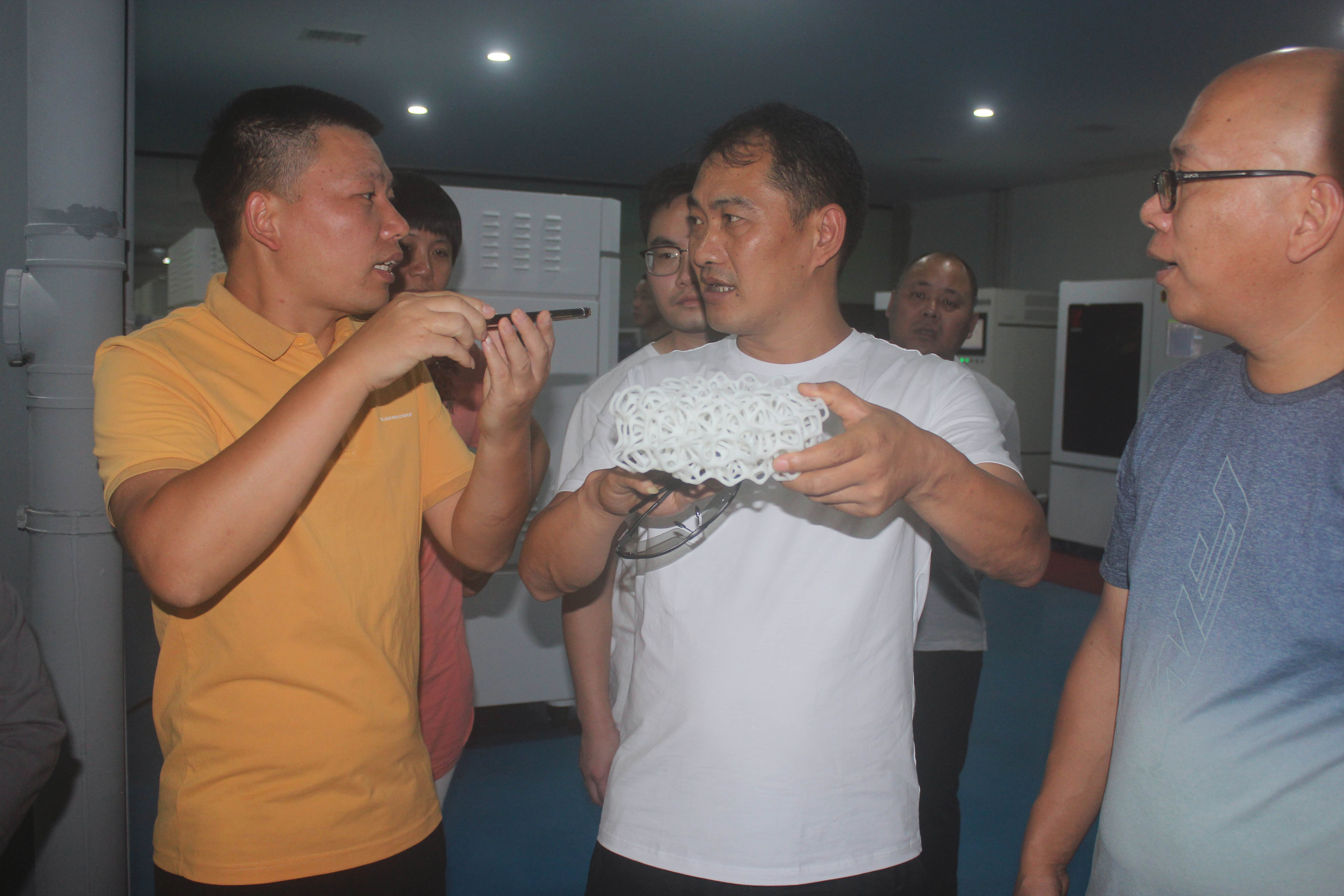 隨后帶領(lǐng)大家一一參觀了3D打印車(chē)間與樣品間。3D打印車(chē)間的參觀引起了學(xué)員們濃烈的興趣,多臺(tái)3D打印設(shè)備正在運(yùn)行,陪同的公司領(lǐng)導(dǎo)們向大家介紹了3D打印設(shè)備的亮點(diǎn)、設(shè)備的運(yùn)行原理和正在打印的樣件,大家紛紛駐足觀看現(xiàn)場(chǎng)打印效果,我司領(lǐng)導(dǎo)隆重介紹了我司自主研發(fā)的SLA 3D打印機(jī)自動(dòng)化程度高、操作簡(jiǎn)單,打印產(chǎn)品成本低、形狀多樣、色彩豐富、耗材環(huán)保無(wú)污染,發(fā)展優(yōu)勢(shì)明顯等,學(xué)員們頻頻點(diǎn)頭表示贊嘆。